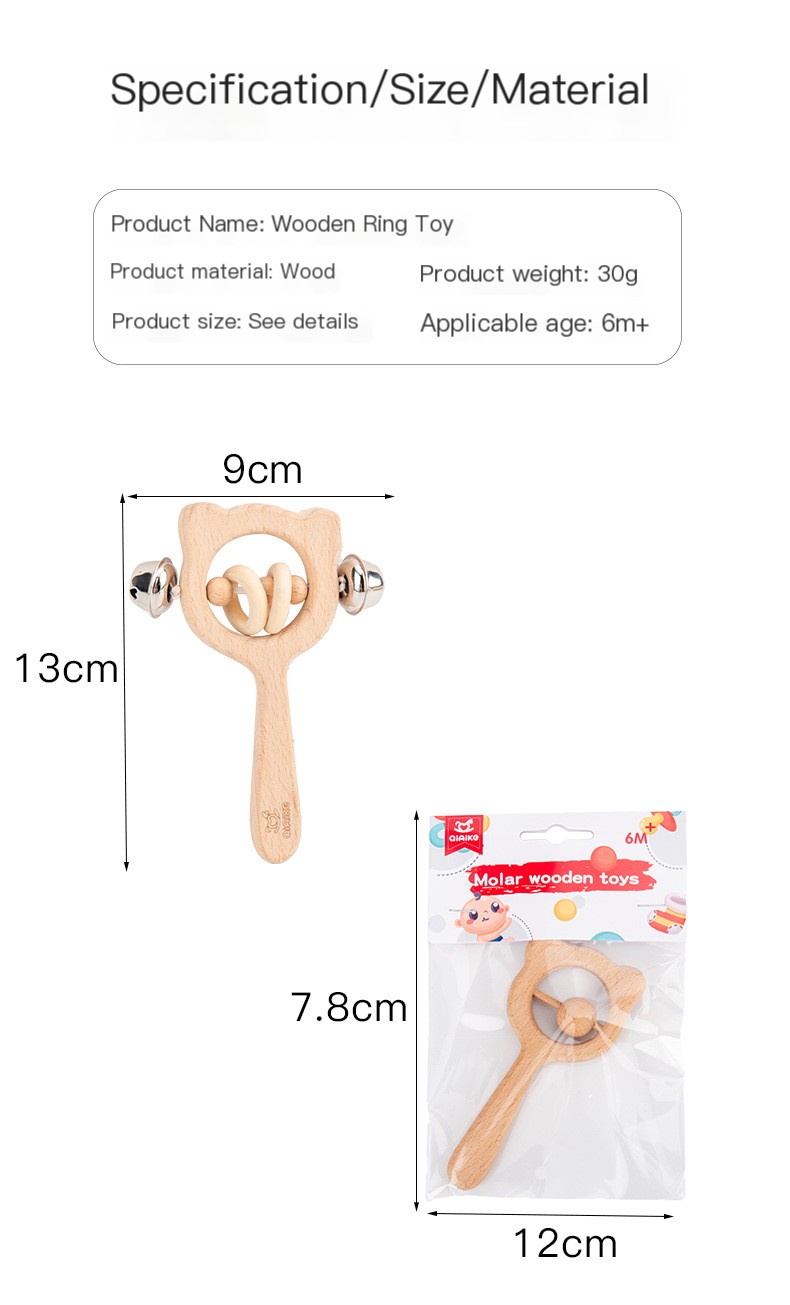 Mit einer kompakten Größe von 13*9cm ist diese Rassel leicht von kleinen Händen zu greifen, fördert Feinmotorik und Hand-Augen-Koordination. Das sanfte Geräusch der Glocke fügt ein auditives Element hinzu, das Ihr Baby engagiert und unterhalten wird.
